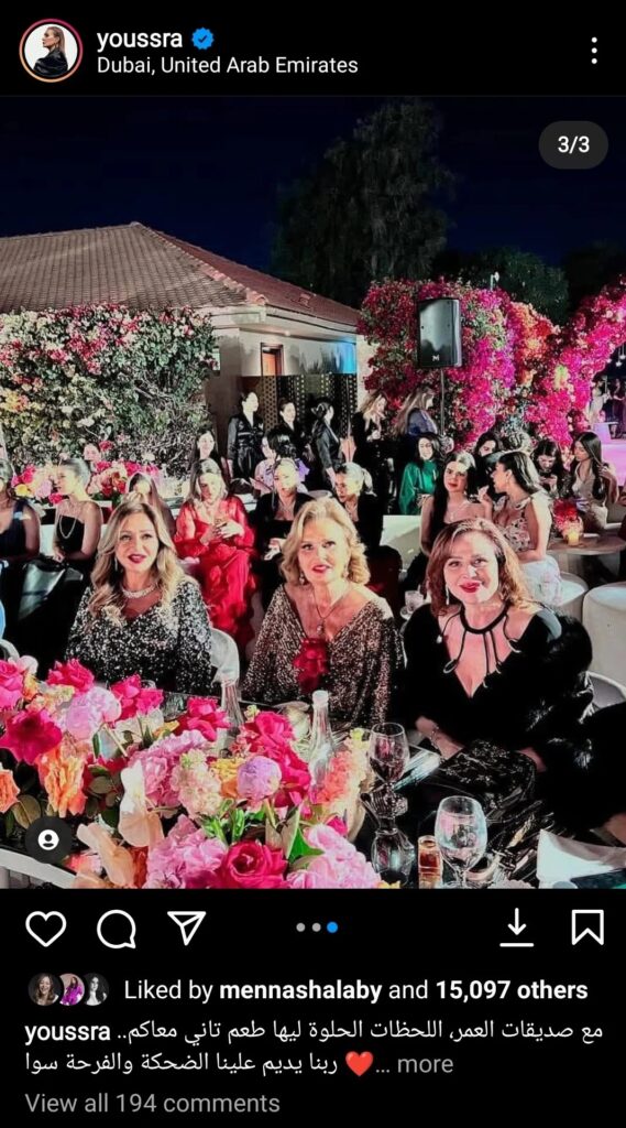 متابعة بتجــرد: شاركت النجمة يسرا، من دبي، صوراً لها عبر حسابها الرسمي على موقع التواصل الاجتماعي “إنستغرام”، ظهرت فيها مع النجمات إلهام شاهين، وليلى علوي، والمخرجة إيناس الدغيدي، بإطلالات متنوعة وأنيقة، أثناء حضورهن إحدى حفلات الزفاف، في مدينة دبي بدولة الإمارات.