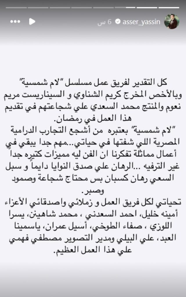 ونشر آسر ياسين عبر خاصية “الستوري” على حسابه الرسمي في إنستغرام، رسالة قال فيها: “كل التقدير لفريق عمل مسلسل لام شمسية، وبالأخص المخرج كريم الشناوي، والسيناريست مريم نعوم، والمنتج محمد السعدي، على شجاعتهم في تقديم هذا العمل في رمضان.”