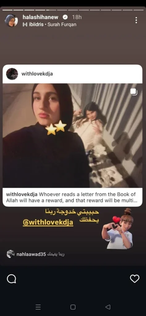 وعلّقت حلا على مقاطع الفيديو بالقول: “حبيبتي خدّوجة ربّنا يحفظك”، ما اعتبره البعض مؤشراً على احتمال عودتها إلى الحجاب مجدداً، خصوصاً بعد ظهورها خلال الفترة الأخيرة بصور ترتدي فيها الحجاب أيضاً، عقب غياب ملحوظ عن مواقع التواصل.