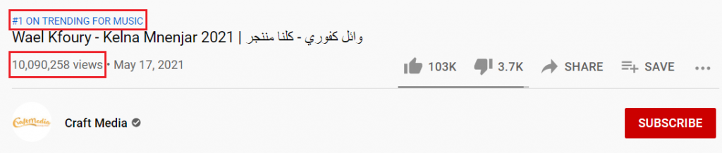 متابعة بتجــرد: لا تزال أغنية “كلنا مننجر” للنجم اللبناني وائل كفوري تتصدّر قائمة الفيديوهات الأكثر رواجًا على موقع “يوتيوب” في لبنان وذلك بعد مرور أسبوعين على صدورها.