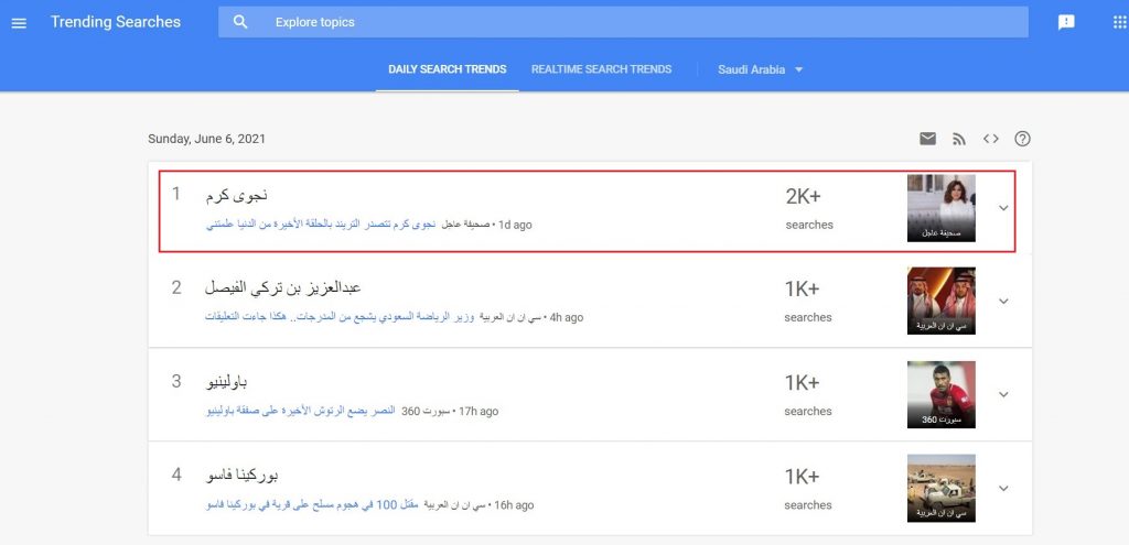 وتصدرت نجوى كرم الترند بمؤشر البحث في موقع غوغل مقتحمةً قائمة الأكثر تداولًا بالمركز الأوّل في المملكة العربية السعودية، بعد اعلانها عن حفلها في “فور سيزونز الرياض” وسط تفاعل كبير من المتابعين السعوديين على مواقع التواصل الإجتماعي.