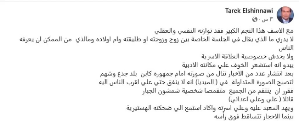وفي رسالته النارية، كتب الشناوي: “مع الأسف، هذا النجم الكبير فقد توازنه النفسي والعقلي، لا يدري ما الذي يقال في الجلسة الخاصة بين زوج وزوجة أو طليقة وأم أولاده، وما الذي يمكن أن يعرفه الناس دون أن يخدش خصوصية العلاقة الأسرية”.