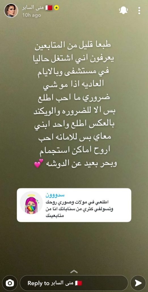 جاء ذلك رداً على طلب إحدى متابعاتها قالت لها: “اطلعي في مولات وصوري روحك وتسولفي كثري من سناباتك أنا من متابعينك”، فأجابت قائلةً: “طبعاً قليل من المتابعين يعرفون أني أشتغل حالياً في مستشفى”.
