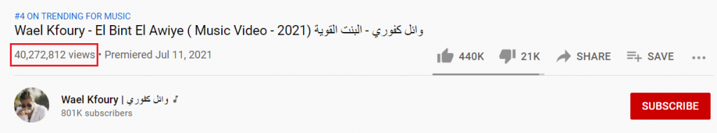 متابعة بتجــرد: لايزال كليب أغنية “البنت القوية”، للنجم اللبناني وائل كفوري، يحصد النجاح ويحقق مشاهدات عالية ويتصدر قائمة الأكثر تداولاً، منذ طرحه على موقع الفيديوهات العالمي “يوتيوب”، في 12 يوليو الماضي.