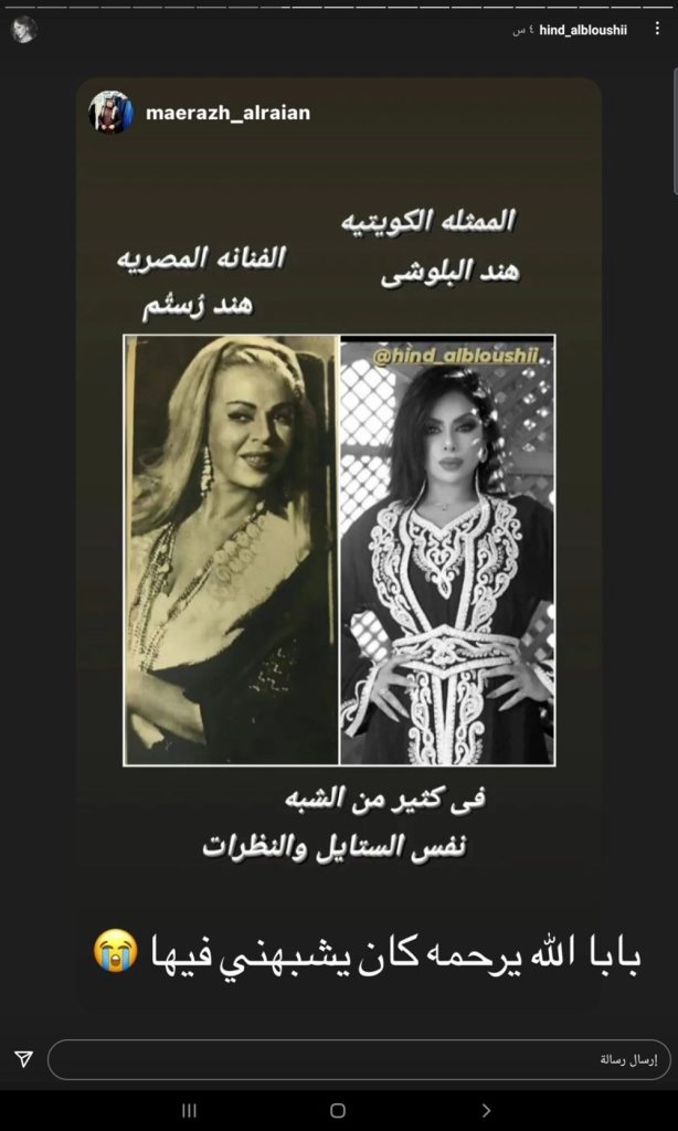 ونشرت البلوشي، عبر “ستوري” حسابها في “إنستغرام”، صورة نشرها أحد المتابعين لها؛ تضمنت صورة لها وبجوارها صورة أخرى للفنانة هند رستم.