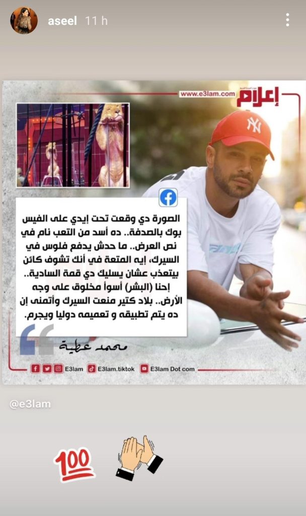 وكان محمد عطية قد غرد، قائلاً: “ده أسد من التعب نام في نص العرض.. ما حدش يدفع فلوس في (السيرك).. إيه المتعة في إنك تشوف كائن بيتعذب عشان يسليك.. دي قمة السادية.. إحنا (البشر) أسوأ مخلوق على وجه الأرض.. بلاد كتير منعت السيرك، وأتمنى إن ده يتم تطبيقه دولياً ويجرم.. مين إنسان سوي ممكن يستمتع بحاجة زي دي؟؟”.