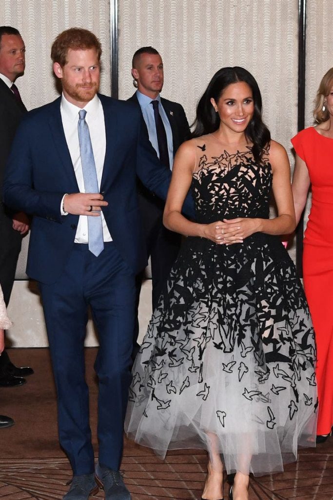 في أول مشاركة رسميّة لها إلى جانب الملكة إليزابيت الثانية، ظهرت ميغان في العام 2018 بثوب باللون الكريمي كان لافتاً بتصميمه عند الكتفين وحمل توقيع دار Givenchy. وهي استعانت بالدار نفسها في تصميم باللون الأسود ارتدته خلال العيد المئة للقوى الجويّة الملكيّة في العام 2018 أيضاً.
