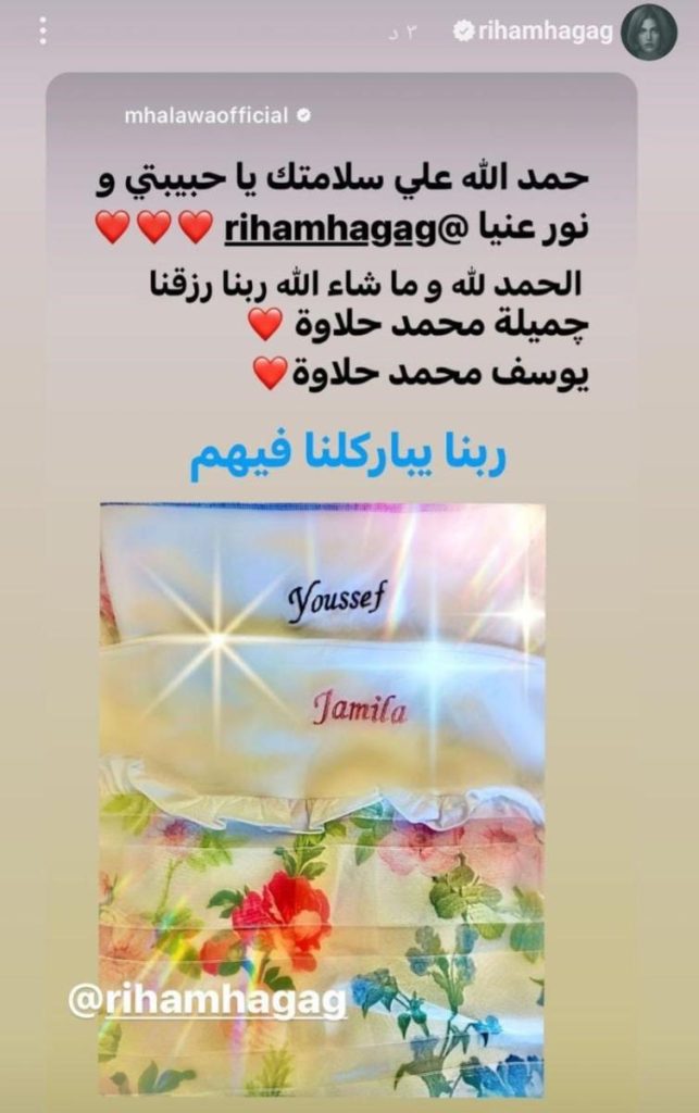 وأعرب والد الصغيرين عن سعادته بقدوم طفليه وسلامة والدتهما، معلقاً: “حمد الله على سلامتك يا حبيبتي ونور عنيا الحمد لله و ما شاء الله ربنا رزقنا جميلة محمد حلاوة ويوسف محمد حلاوة”.