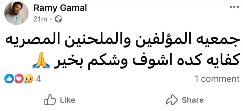 متابعة بتجــرد: أثار الفنان المصري رامي جمال حالة من الجدل على مواقع التواصل الاجتماعي بعد نشره منشوراً غامضاً عبر صفحته الرسمية على “فيسبوك”، وجّه فيه رسالة مختصرة إلى جمعية المؤلفين والملحنين المصريين قال فيها: “جمعية المؤلفين والملحنين المصرية… كفاية كده، أشوف وشّكم بخير”.
