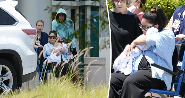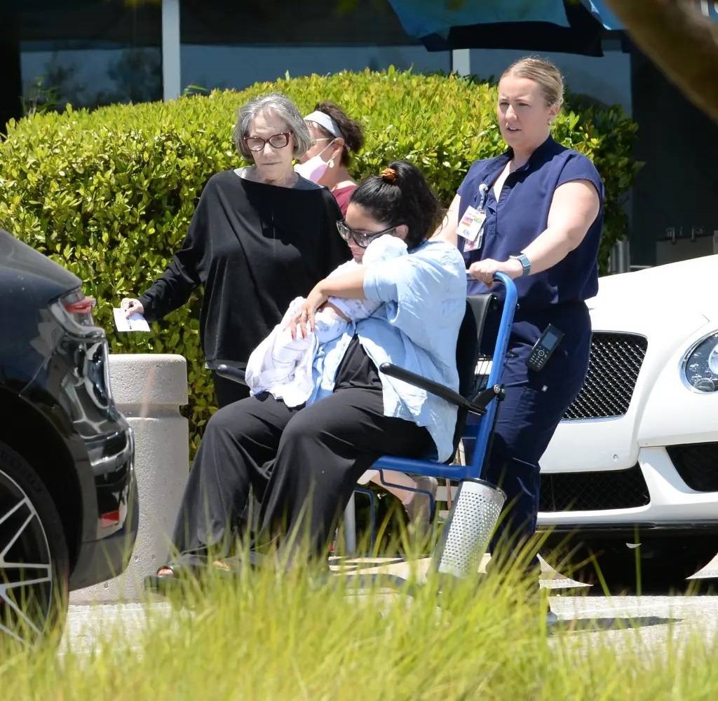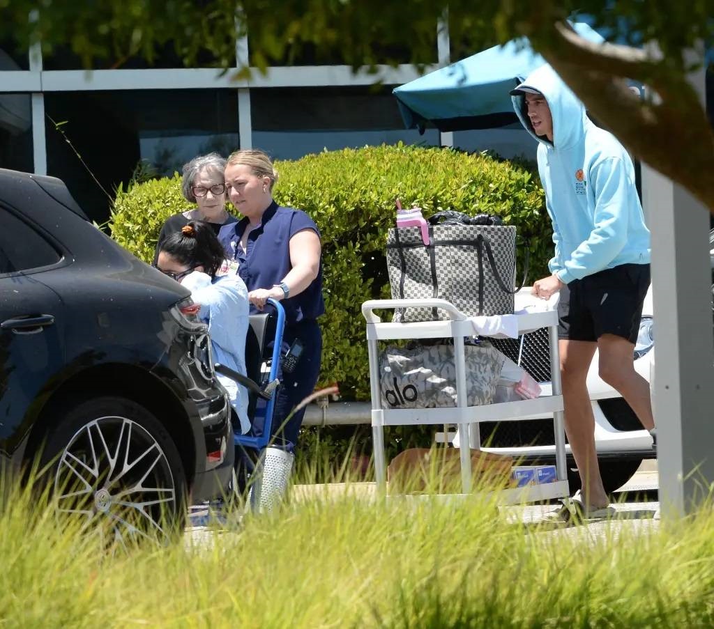 وحرصت هادجنز على ارتداء النظّارات الشمسية بينما كان الثلاثي في طريقهم إلى سيارتهم، برفقة طاقم المستشفى.