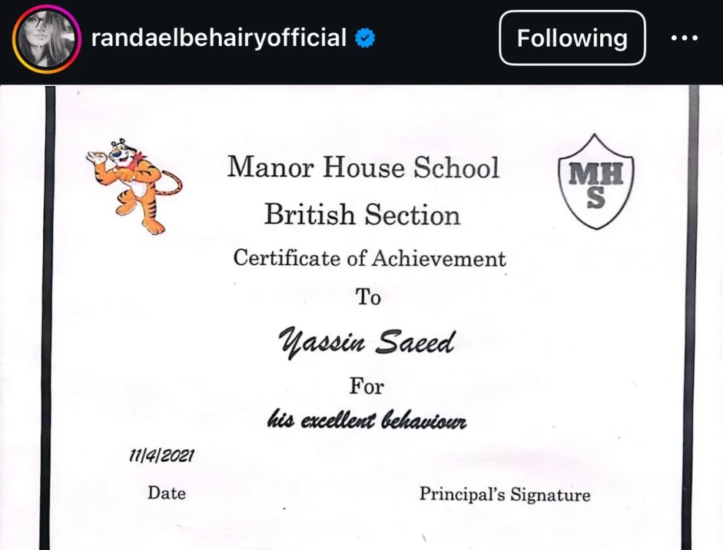 ونشرت راندا عبر حسابها الخاص في “إنستغرام” شهادة ابنها من مدرسته بحسن الأخلاق، ووجهت رسالة لجمهورها قالت فيها: “بسم الله ما شاء الله ولا حول ولا قوة إلا بالله، قولوا ما شاءالله تعالى، ابني المحترم اللي عهدت على نفسي إني أقدّمه هدية للمجتمع ولدولتنا الحبيبة مصر، حصد شهادات عديدة لكني أصريت إني لما أنزل لكم منها شهادة واحدة تكون دي، تكون شهادة بحسن الأخلاق من مدرسته ومدرّسينه”.