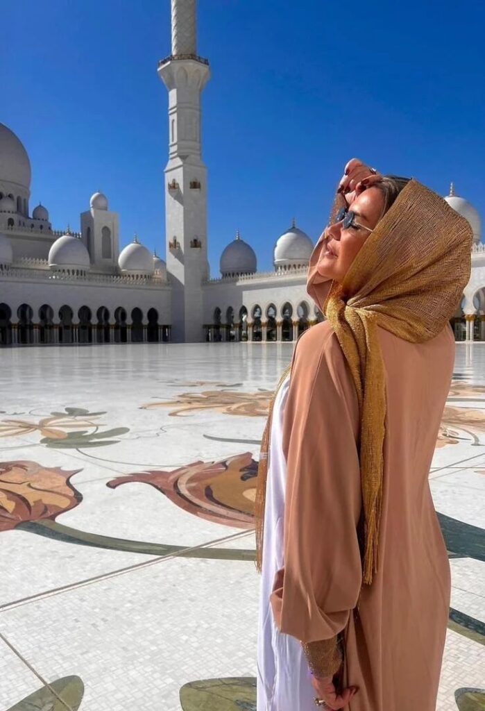 وشاركت متابعيها عبر حسابها الشخصي على منصة “إنستغرام”، وهي ترتدي عباءة أثناء تواجدها في ساحة مسجد الشيخ زايد الشهير في مدينة أبو ظبي.