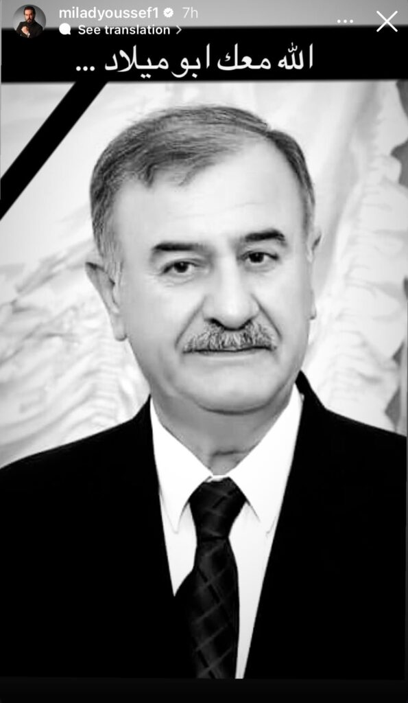 ونشر يوسف صورة بالأبيض والأسود لوالده الراحل، وكتب معلقاً: “الله معك أبو ميلاد”، في رسالة تعبر عن حزنه العميق لفراقه.
