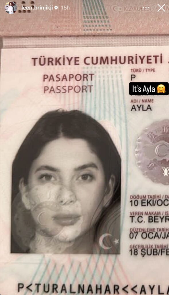 لاحقاً، نشرت لين صورة لجواز سفرها التركي، موضحة أن اسمها الآخر هو “آيلا”، مما أثار تفاعلاً واسعاً بين متابعيها. كما تابعت سؤالهم عن الاسم الذي يفضلون أن يُنادى به، “لين” أم “آيلا”، لتتباين إجابات المتابعين بين الاسمين.