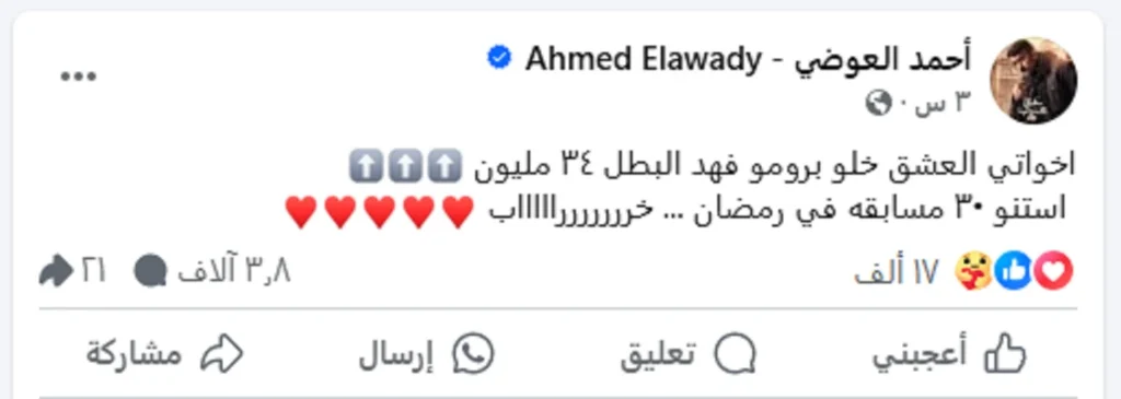 وقال أحمد العوضي في منشوره: “إخواتي العشق خلو برومو فهد البطل 34 مليون، استنوا 30 مسابقة في رمضان… خررراااااب”.