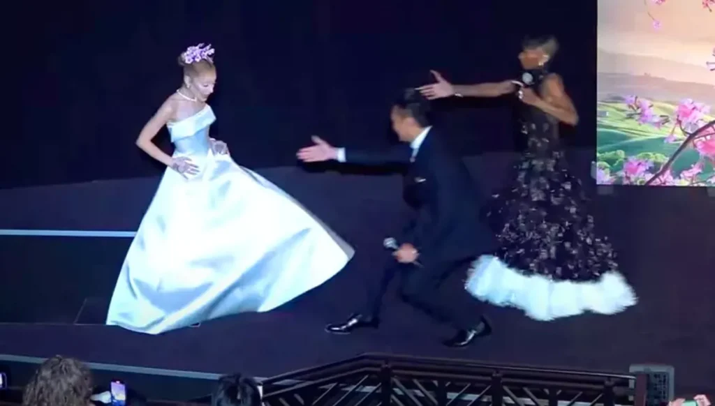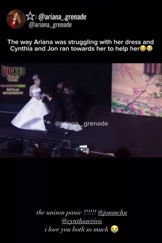 متابعة بتجــرد: واجهت الفنانة والممثلة الأميركية أريانا غراندي مشكلة في ملابسها، في العرض الأول لفيلمها الجديد “ويكيد” (Wicked) في طوكيو، لكنّها تلقّت مساعدة سريعة من بطلة الفيلم سينثيا إريفو والمخرج جون إم تشو، اللّذَين سارعا لإنقاذ الموقف.