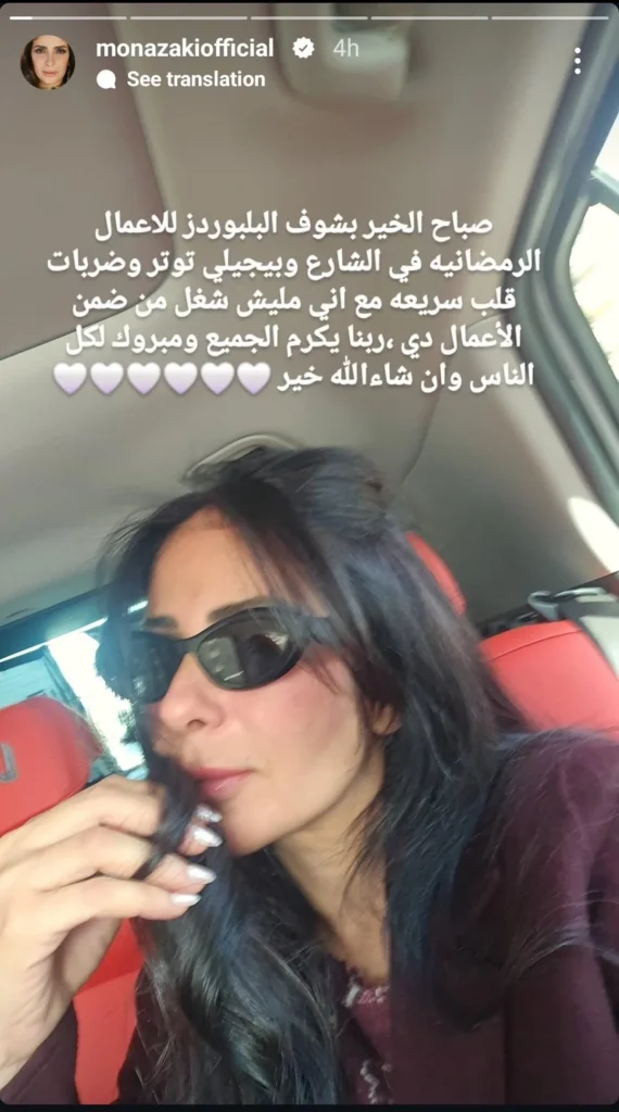 وكتبت منى: “صباح الخير بشوف البلبوردر للأعمال الرمضانية في الشارع وبيجيلي توتر وضربات قلب سريعة مع إني مليش شغل من الأعمال دي، ربنا يكرم الجميع ومبروك لكل الناس وإن شاء الله خير”.