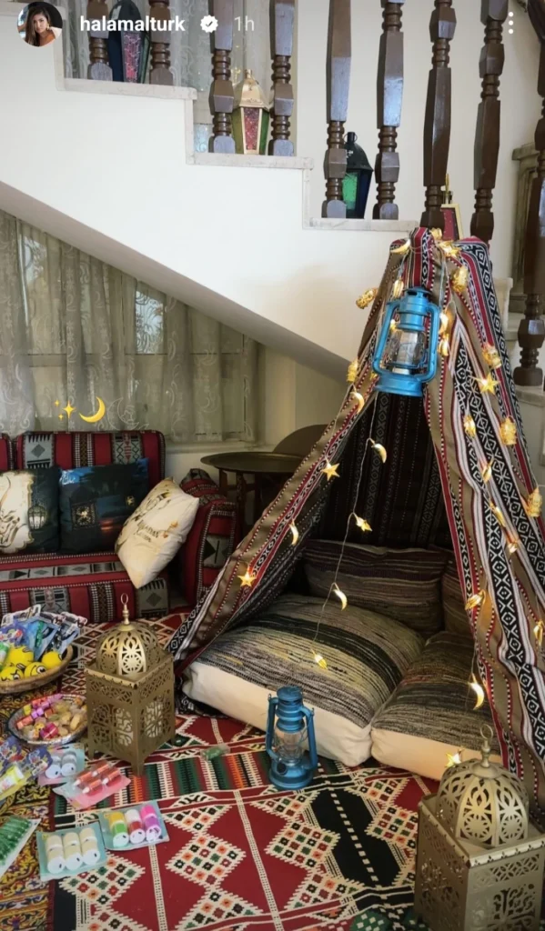 وفي وقت سابق، استعرضت حلا الترك الزينة في منزلها، وشاركت متابعيها بصورة للجلسة العربية مع الخيمة الجميلة التي أعدّتها بالقرب من السلالم، وجهزت المكان بالفوانيس الملوّنة ومتعددة الأحجام، إضافة الى الوسائد المزيّنة بصور رمضانية مع الحلوى والألوان، ونقلت الأجواء في منزلها بطريقة جميلة الى الجمهور.