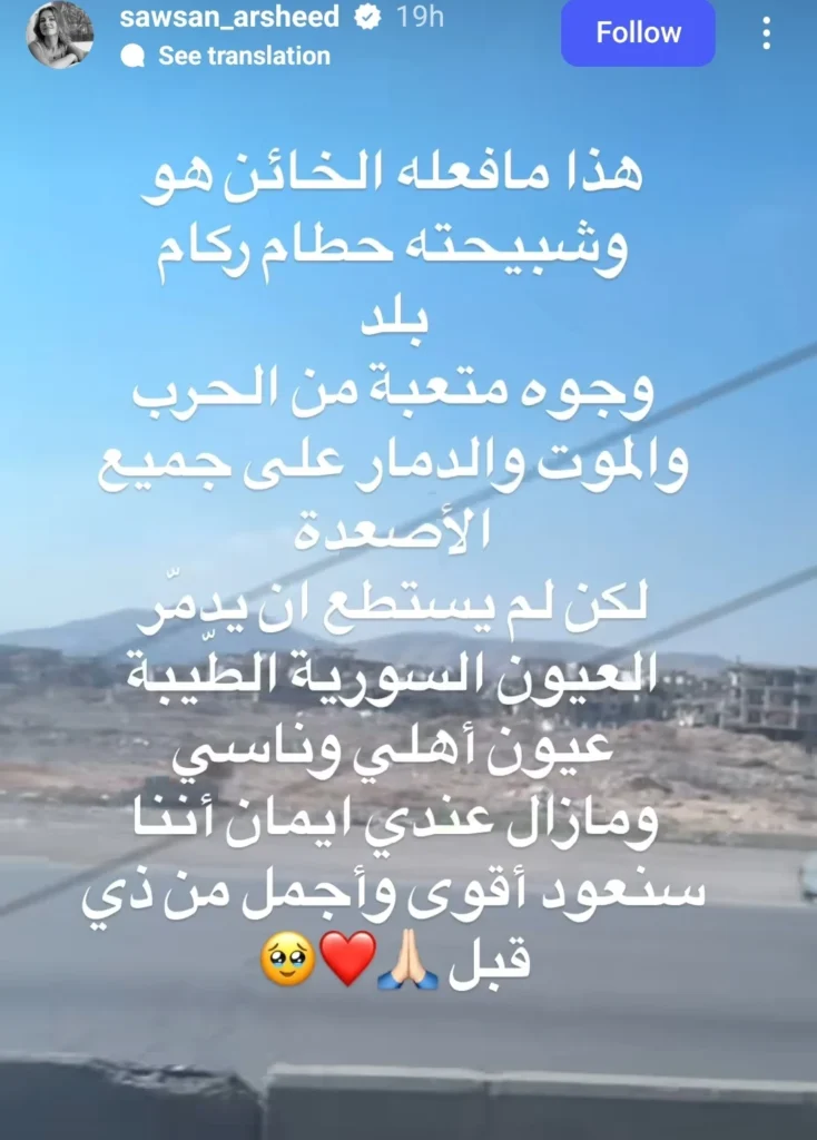 ووثّقت سوسن من خلال صور وفيديوهات نشرتها عبر خاصية الستوريز في “إنستغرام” رحلتها في سوريا، وعبّرت عن حزنها الشديد لرؤية مشاهد الدمار والوجوه المُتعبة، ولكنها بدت في غاية السعادة للقائها بأهلها بعد سنوات أمضتها في الغربة.