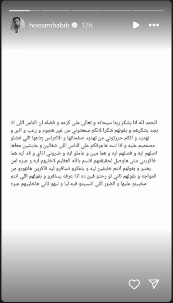 متابعة بتجــرد: نشر الفنان حسام حبيب، على خاصية القصص المصورة الملحقة على حسابه الخاص بـ”إنستغرام” منشورًا وجّه من خلاله رسالة لجمهوره، علق فيه على تصريحاته الأخيرة مع الإعلامية بسمة وهبة في برنامج “العرافة”، وحديثه عن علاقته بالفنانة شيرين عبد الوهاب.
