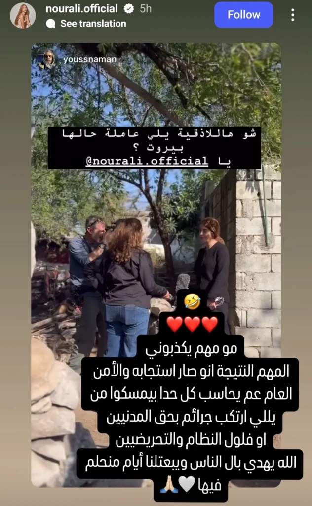 وكذلك نشرت عبر خاصية الستوريز على انستغرام صوراً من اللاذقية ومن كواليس التصوير، وارفقتها بتعليق كتبت فيه: “مو مهم يكذبوني، المهم انه صار في استجابة والامن العام عم يحاسب كل حدا بيمسكوا من يلي ارتكب جرائم بحق المدنيين. الله يهدي بال الناس”.