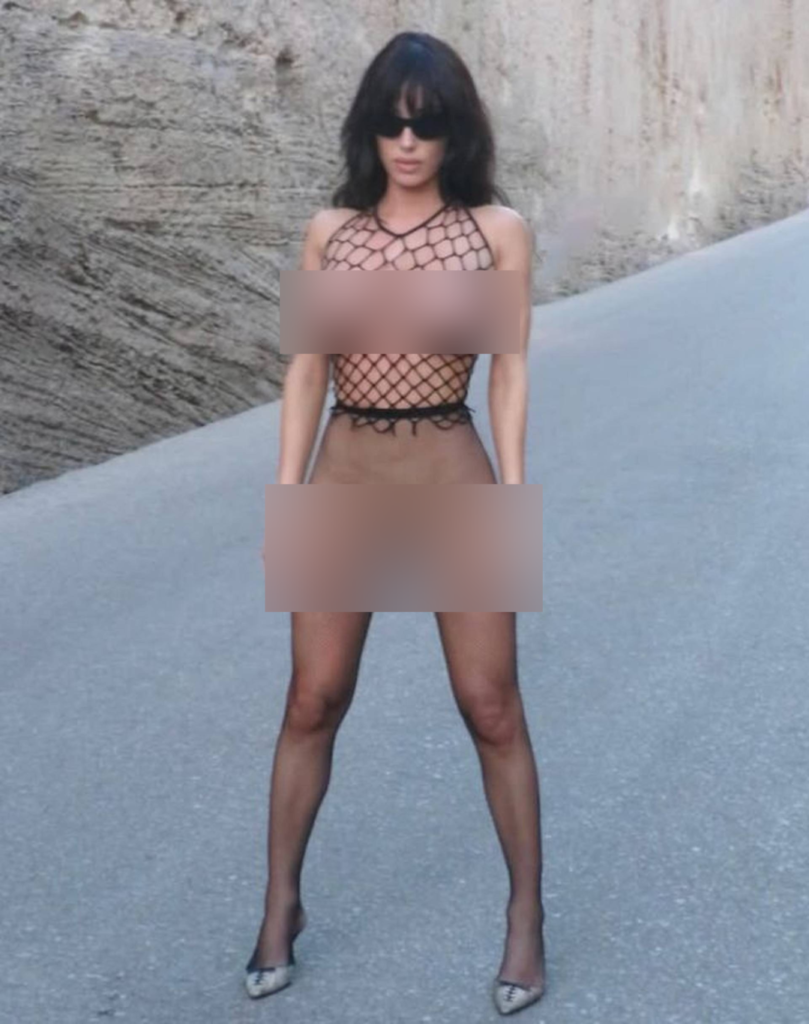ورغم جرأة الإطلالة، اعتمدت سينسوري نظارة شمسية داكنة، وتركت شعرها الداكن منسدلًا مع غرّة أمامية، وانتعلت حذاء رماديًا عالي الكعب بتصميم رباط أمامي، بينما أضافت تأثيرًا ضبابيًا على الصور كحيلة للتحايل على قواعد المنصة.