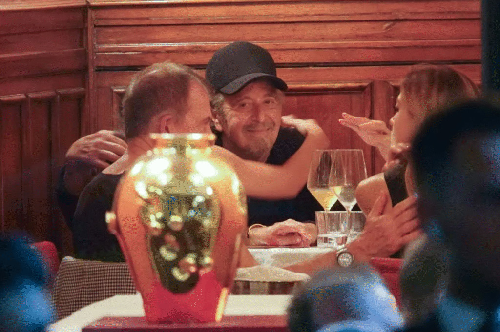 وخطف اللقاء الأنظار بعدما أظهرت الصور لحظة تلقّي آل باتشينو قبلة رقيقة على خدّه من الصحفية الإيطالية كاترينا دي تيرليزي، التي بدت منسجمة ومهتمة خلال حديثها مع نجم هوليوود الشهير قبل أن تميل نحوه وتبادره بالموقف العفوي.