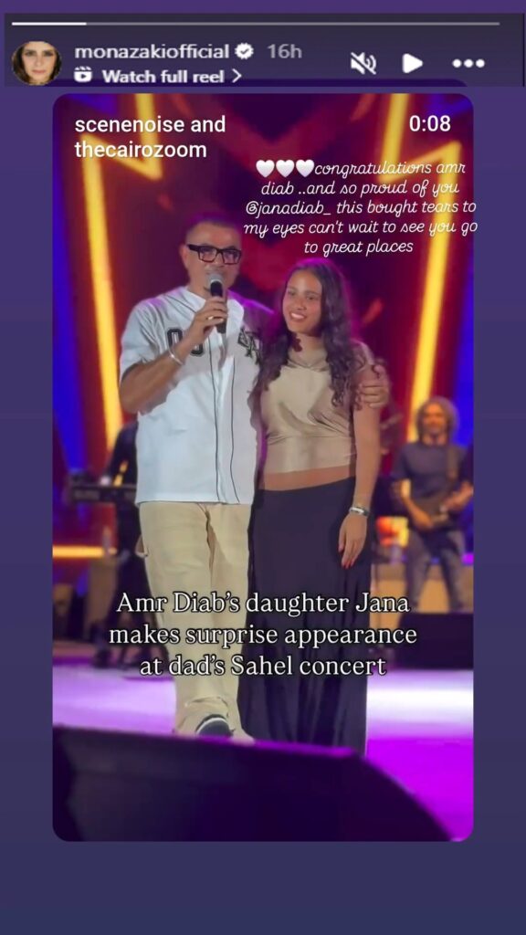 ووجّهت منى زكي رسالة مؤثرة جاء فيها: “مبروك لعمرو دياب وفخورة جدًا بجنا.. المشهد ده خلّى دموعي تنزل بجد، منتظرة أشوفك بتوصلي لأعلى الأماكن”، في تعبير صادق عن دعمها الكبير لموهبة جنا المتصاعدة.