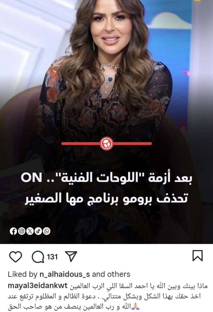 ونشرت العيدان عبر حسابها صورة لمها الصغير مرفقة بعنوان “أزمة اللوحات الفنية”، وعلّقت قائلة: “ماذا بينك وبين الله يا أحمد السقا، اللي الرب العالمين أخذ حقك بهذا الشكل وبشكل متتالي… دعوة الظالم والمظلوم ترتفع عند الله، ورب العالمين ينصف من هو صاحب الحق.”
