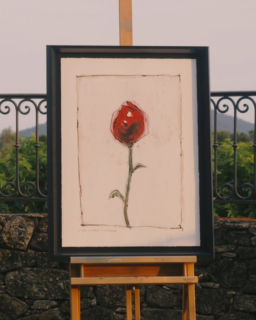 أما اللوحة الثانية، فجاءت بعنوان “الوردة هي الوردة هي الوردة”، وتحمل رمزية خاصة، إذ استوحاها من تقليد شخصي اتبعه مع ابنته ليلي روز، حيث اعتاد أن يرسم لها وردة في كل عيد حب، ويهدي فانيسا باراديس باقة مرسومة بمناسبة عيد الأم.
