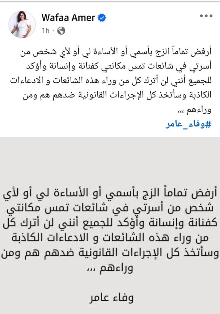 كما نشرت عبر حسابها الرسمي على “فيسبوك” بياناً حذرت فيه من الزج باسمها أو باسم عائلتها في أخبار مغلوطة تمس بسمعتها، مؤكدة أنها ستلجأ إلى القضاء لملاحقة مروجي هذه الادعاءات قانونيًا، والحفاظ على حقها وكرامتها أمام الرأي العام.