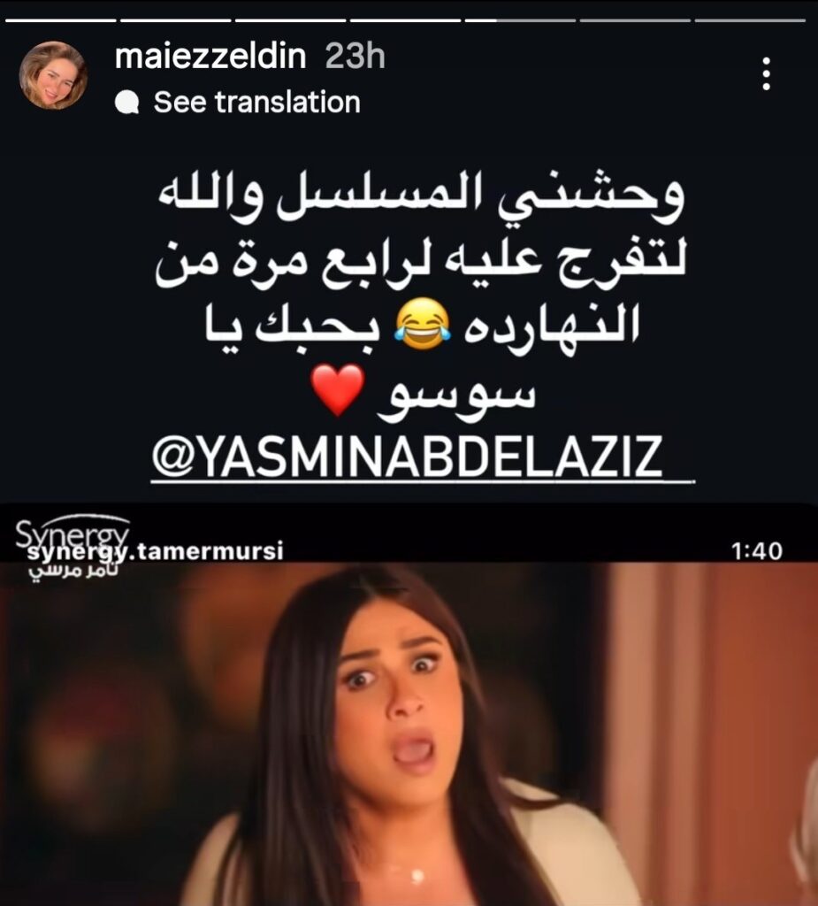 من جهة أخرى، عبّرت مي عز الدين عن اشتياقها لمتابعة مسلسل “وتقابل حبيب” الذي شاركت في بطولته النجمة ياسمين عبد العزيز، وتم عرضه في موسم دراما رمضان 2025. ونشرت مي مقطعاً من العمل عبر خاصية “الستوريز” في حسابها على “إنستغرام”، وعلّقت عليه بالقول: “وحشني المسلسل، والله لتفرج عليه لرابع مرة من النهاردة، بحبك يا سوسو”.