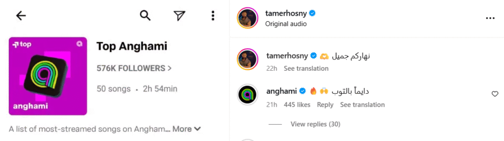 وتفاعلت منصة “أنغامي” بدورها مع منشور تامر حسني، حيث أعادت نشره وعلّقت عليه بعبارة: “دايمًا بالتوب”، في إشارة إلى استمرار تصدّره الدائم لقوائمها، ما يعكس العلاقة القوية بين الفنان وجمهوره على المنصات الرقمية.
