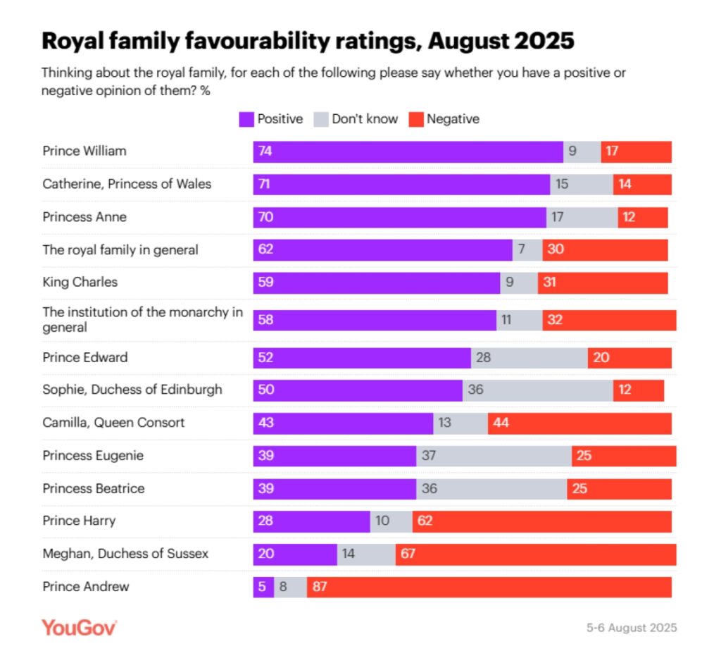 جاء الأمير أندرو في المرتبة الأخيرة بنسبة 5% تأييد فقط، مقابل رفض ساحق بلغ 87%، استمرارًا لتداعيات أزماته الإعلامية منذ عام 2019.