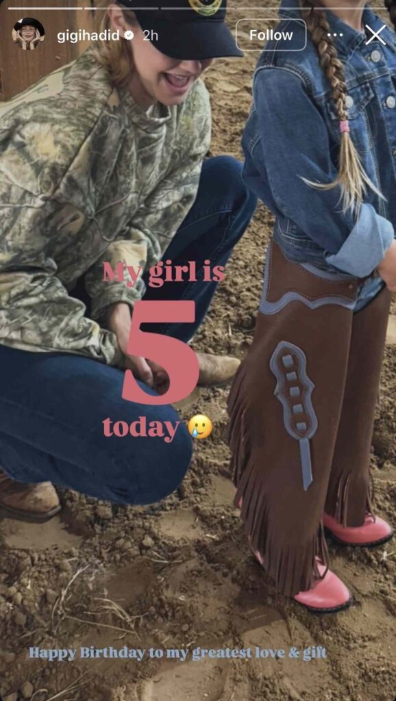 اختارت جيجي حديد أن تُحيي الذكرى الخامسة لميلاد خاي عبر قصصها على “إنستغرام”. وظهرت في إحدى الصور بإطلالة كاجوال أنيقة داخل حظيرة، مرتدية سترة مموهة وبنطال جينز داكن مع حذاء رعاة بقر. جلست حديد خلف ابنتها التي تألقت بإطلالة غربية طفولية مميزة، شملت جاكيت جينز فاتح وبنطال مماثل وحذاء جلدي بني مزين بالشراريب، وأكملت خاي اللوك بحذاء وردي بأحذية رعاة البقر وضفيرتين طويلتين حتى الخصر.