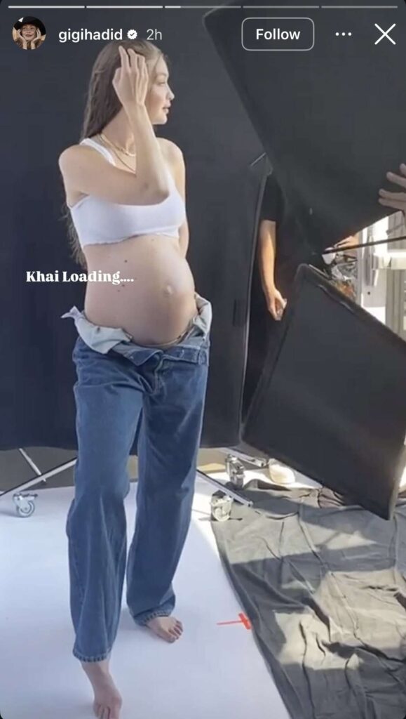 كما شاركت حديد صورًا مؤثرة من لحظات الحمل، ظهرت فيها خاي ببنطال جينز مفتوح وقميص أبيض قصير، فيما اختارت لمسة جمالية بمكياج عيون دخاني وتسريحة شعر مبلل. وأرفقت الصور بعبارات مؤثرة مثل: “خاي جاهزة…” و”محظوظة جدًا لأني أمك”.