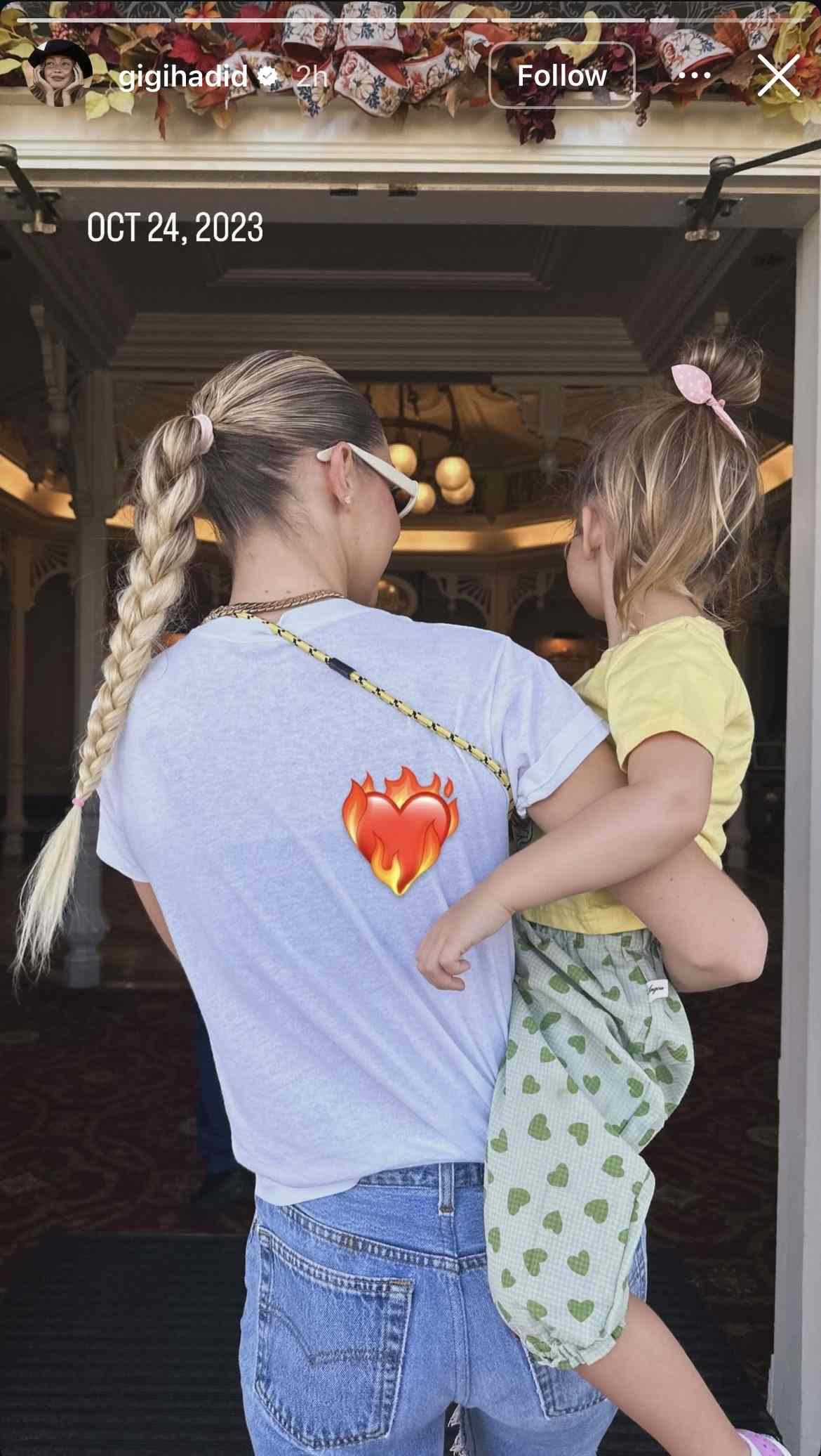 وفي صورة أخرى عائلية، ظهرت جيجي ببساطة لافتة بقميص أبيض وبنطال جينز، وشعرها مضفر على شكل ذيل حصان طويل، وهي تحمل ابنتها التي ارتدت بنطالًا أخضر مزينًا بقلوب وقميصًا أصفر كناري. وكعادتها، أخفت جيجي وجه خاي حفاظًا على خصوصيتها، وأشارت إلى أن الصورة التُقطت في أكتوبر 2023.