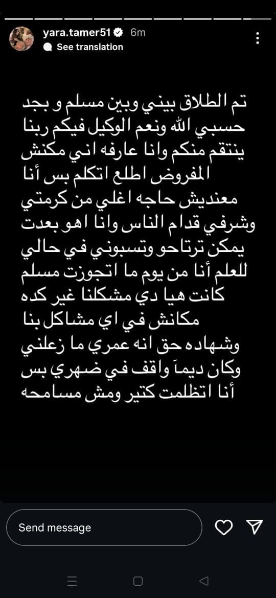 من جانبها، ردّت يارا تامر عبر صفحتها الخاصة على “إنستغرام”، مؤكدة خبر الطلاق، وقالت: “تم الطلاق بيني وبين مسلم، وبجد حسبي الله ونِعم الوكيل فيكم… أنا ما عنديش حاجة أغلى من كرامتي وشرفي قدّام الناس”. وأضافت أنّها عانت من ضغوط كبيرة منذ بداية الزواج، مشيرةً إلى أنّ مسلم لم يسيء إليها يوماً وكان دائماً داعماً لها، لكنها تعرّضت لظلم شديد على حدّ تعبيرها.