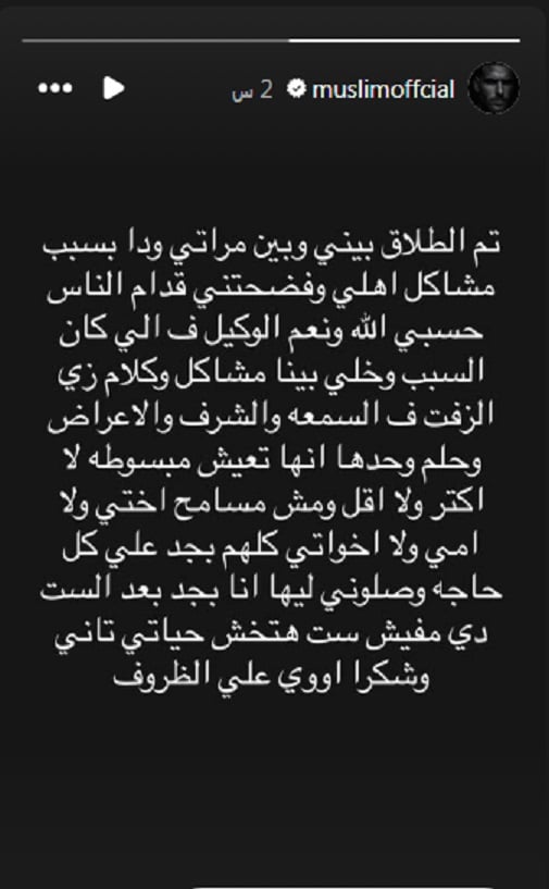 كتب مسلم في منشوره قائلاً: “تم الطلاق بيني وبين مراتي ودا بسبب مشاكل أهلي وفضحتني قدّام الناس، حسبي الله ونِعم الوكيل في اللي كان السبب وخلّى بينا مشاكل وكلام زي الزفت في السمعة والشرف والأعراض”. وأشار إلى أنّ الخلافات العائلية كانت السبب الرئيسي وراء الانفصال، مضيفاً: “بعد الست دي مفيش ست هتخش حياتي تاني”.