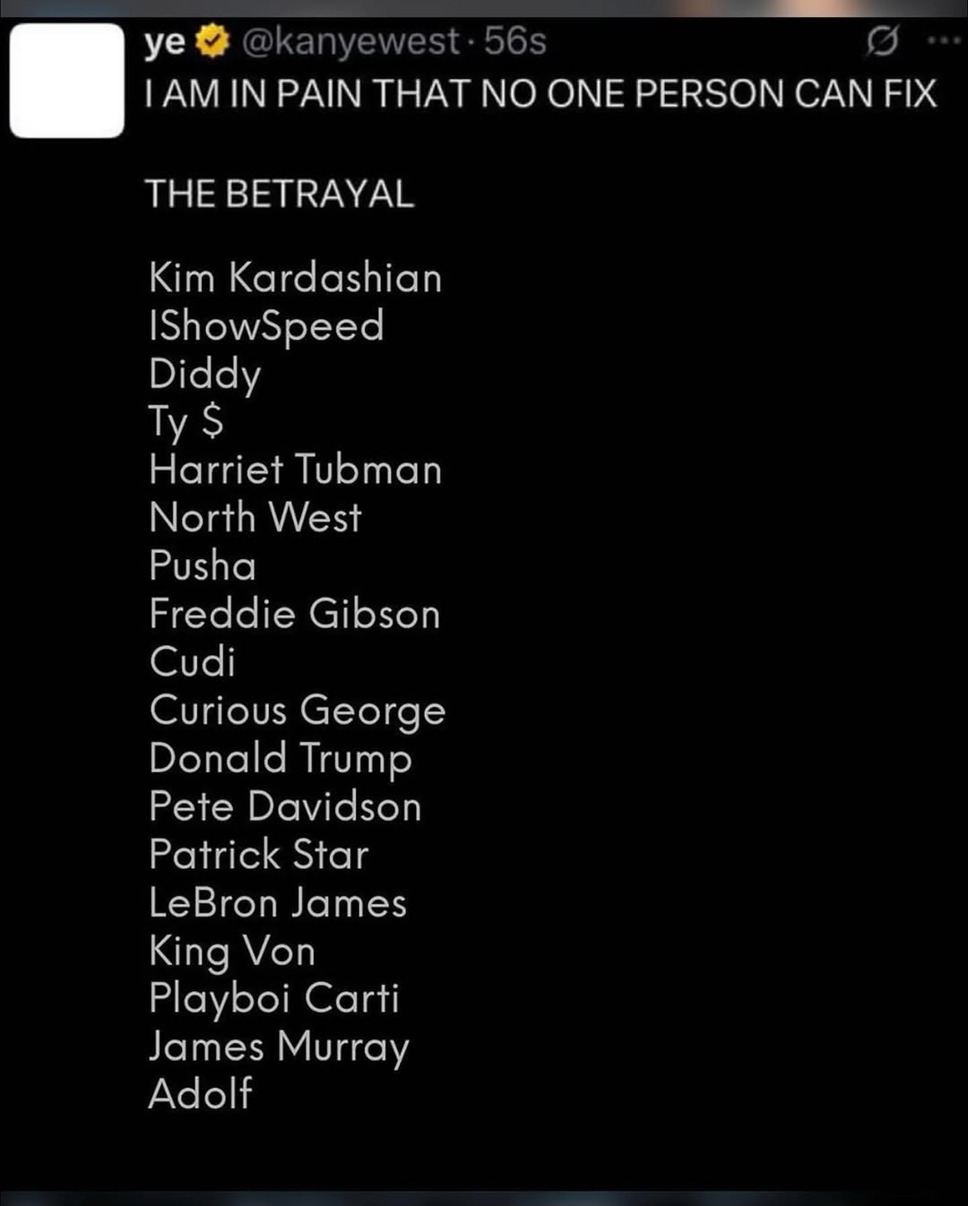 ويست شارك ما أسماه “قائمة الخيانة” عبر حسابه الرسمي في منصة “إكس” أمام نحو 33 مليون متابع، قبل أن يعمد لاحقًا إلى حذفها. وكتب في منشوره أن الأسماء المدرجة تسببت له بألم “لا يمكن لأحد إصلاحه”.