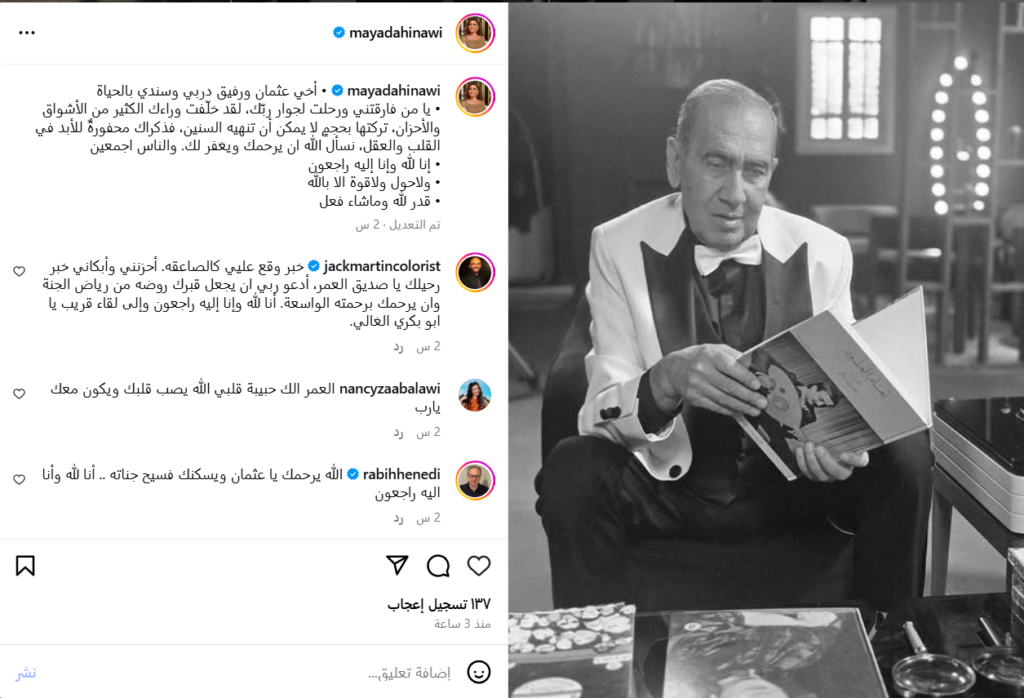 وكان قد رحل عن عالمنا يوم الإثنين 13 أكتوبر الملحن والباحث الموسيقي عثمان الحناوي، بعد معاناة طويلة مع مرض الفشل الكلوي. ويُعد الراحل من الشخصيات المعروفة في الوسط الموسيقي السوري والعربي، حيث قدّم العديد من الدراسات والأعمال البحثية الفنية، كما ارتبط اسمه بمسيرة شقيقته الفنانة الكبيرة ميادة الحناوي، التي طالما أشادت بدعمه لها في مشوارها الفني.