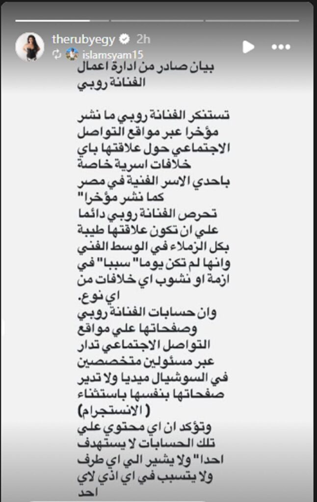 وجاء في البيان: “تستنكر الفنانة روبي ما نُشر أخيراً عبر مواقع التواصل الاجتماعي حول علاقتها بأي خلافات أسرية تخص إحدى الأسر الفنية في مصر، كما تم تداوله عبر مواقع التواصل الاجتماعي.”