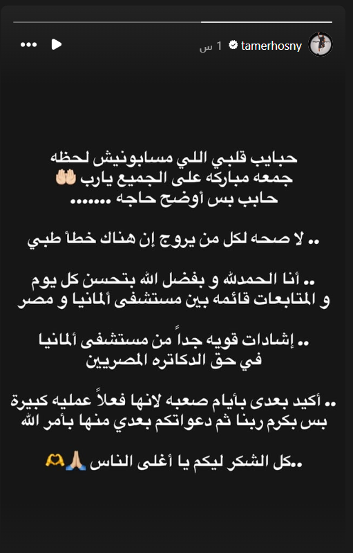 وكتب تامر حسني عبر خاصية الستوري على حسابه في “إنستغرام”: “حبايب قلبي اللي مسابونيش لحظة.. جمعة مباركة على الجميع يا رب.. حابب بس أوضح حاجة… لا صحة لكل من يروّج إن هناك خطأ طبي.”