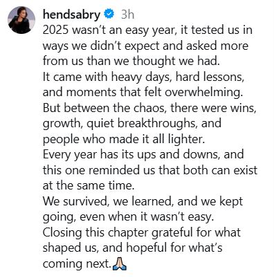 شاركت هند صبري متابعيها مقطع فيديو قصيرًا، استعرضت من خلاله أبرز المحطات والفعاليات التي شاركت بها خلال عام 2025، وعلّقت عليه بكلمات لامست مشاعر كثيرين، قالت فيها: “لم يكن عام 2025 عامًا سهلاً، فقد اختبرنا بطرق لم نتوقعها، وطلب منّا أكثر مما كنا نظن. جاءت معه أيام عصيبة، ودروس قاسية، ولحظات شعرنا فيها بالإرهاق، لكن وسط هذه الفوضى، كانت هناك انتصارات، ونمو، وإنجازات هادئة، وأشخاص خففوا عنا الكثير”.