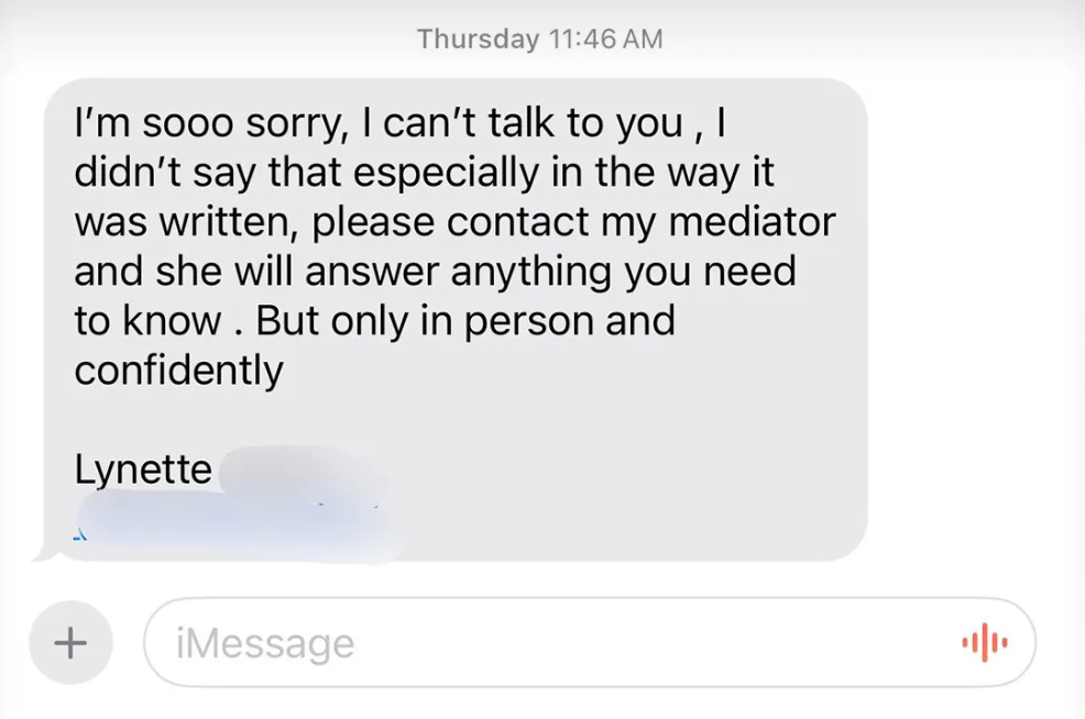 وقالت كاردي بي في تدوينتها: «لم تقل لي تلك المرأة ولو لمرة واحدة أي شيء عن تعرّضها للمس… ولا مرة واحدة!»، كما نشرت صورة لرسالة نصية زعمت أنها واردة من الطاهية، من دون أن يكون سياق المحادثة واضحًا بشكل كامل.