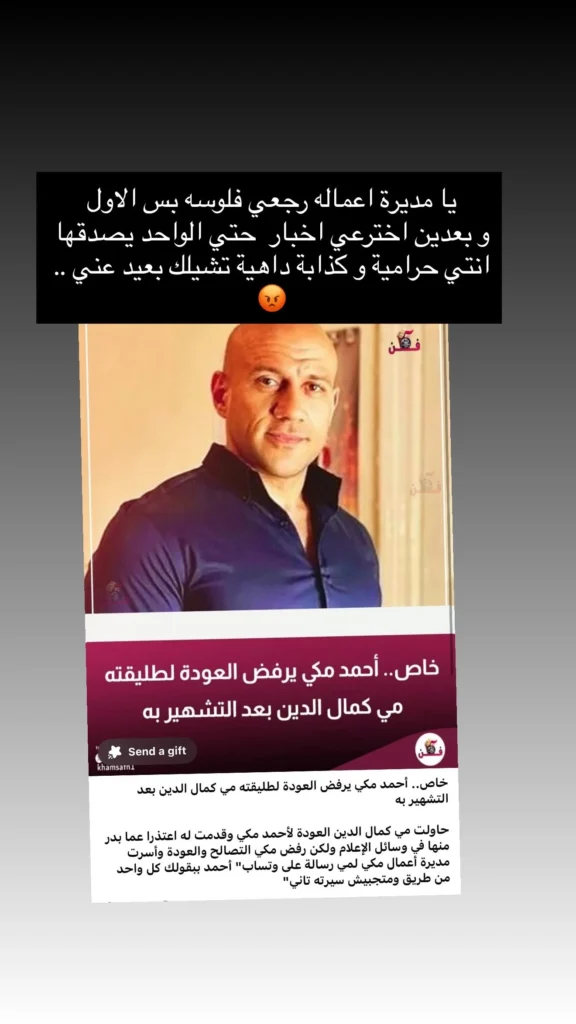 وعادت مي كمال الدين لتشن هجوماً حاداً على مديرة أعمال أحمد مكي السابقة، بعدما أعادت نشر خبر آخر يتعلق بمحاولة عودتها إلى مكي ورفضه ذلك، وعلّقت قائلة: “يا مديرة أعماله رجعي فلوسه بس الأول وبعدين اخترعي أخبار حتى الواحد يصدقها.. أنتي حرامية وكذابة داهية تشيلك بعيد عني”.