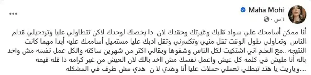 ونشرت مها نصار عبر صفحتها الشخصية على منصة “فيسبوك” منشورًا عبّرت فيه عن غضبها من تصرفات وصفتها بـ”المتطاولة والمسيئة”، مؤكدة أنها صبرت طويلًا على ما تتعرض له، لكنها لم تعد قادرة على تجاهل الأمر. وكتبت: “أنا ممكن أسامحك على سواد قلبك وغيرتك وحقدك لأن ده يخصك لوحدك، لكن تتطاولي عليا وتردحيلي قدام الناس وتحاولي طول الوقت تقللي مني وتكسريني وتقلّي أدبك عليا، مستحيل أسامحك عليه أبدًا مهما كانت النتيجة.. مع العلم إني اشتكيت لكل الناس وبقالي أكتر من شهرين ساكتة والكل عمل نفسه مش واخد باله”.