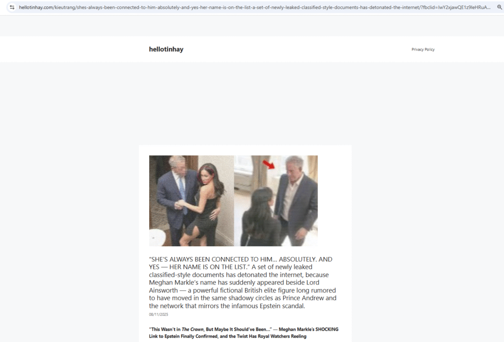 تُظهر الصورة المتداولة ميغان ماركل بفستان قصير تقف إلى جانب رجل وُضع يده على خصرها، مع تمويه وجهه. وقد انتشرت النسخة ذات الجودة المتدنية بكثافة، مرفقة بعبارات صادمة بالعربية والإنكليزية. إلا أن البحث العكسي أظهر أن الصورة نُشرت للمرة الأولى في تشرين الثاني/نوفمبر 2025 ضمن مقال غير موثّق على موقع إلكتروني مثير للشبهات، تضمّن روايات غير مدعومة بأي أدلة أو وثائق.