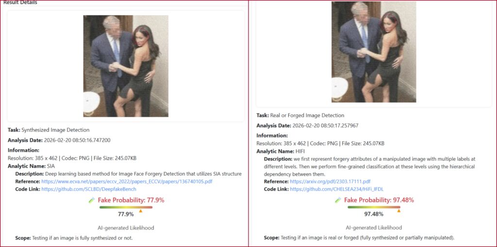 فحص الصورة عبر أدوات متخصصة في كشف التزييف الرقمي أظهر مؤشرات قوية على أنها مركّبة أو معدلة رقمياً، مع نسب مرتفعة لاحتمال التلاعب، ما يعزز الاستنتاج بأنها صورة مفبركة جرى توظيفها ضمن محتوى قائم على الشائعات لجذب التفاعل والنقرات.