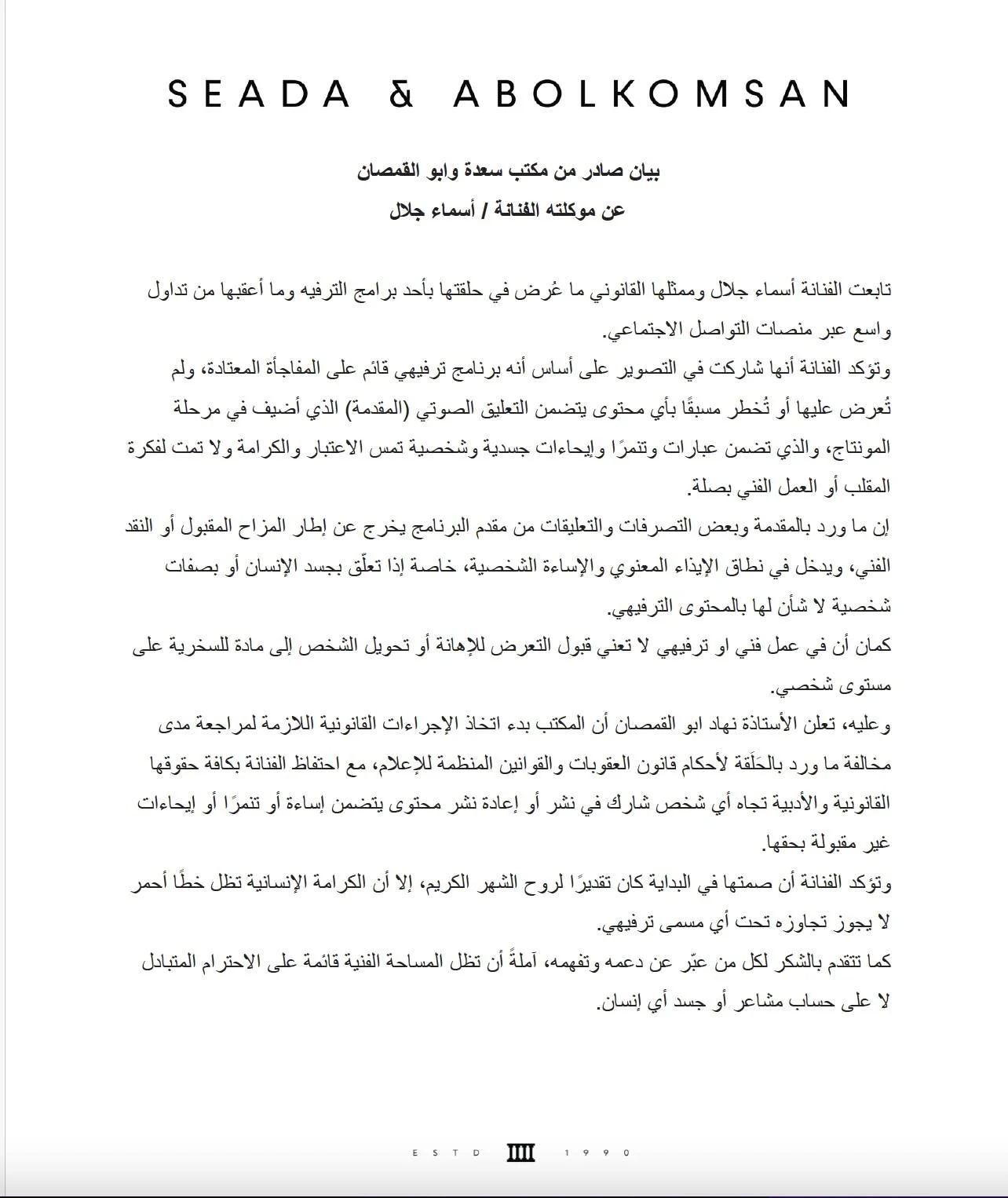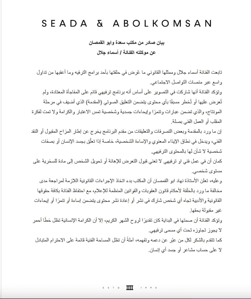 واختتم البيان بتوجيه أسماء جلال الشكر لكل من عبّر عن دعمه وتفهمه، معربة عن أملها في أن تبقى المساحة الفنية قائمة على الاحترام المتبادل، بعيداً عن أي إساءة أو تنمّر.